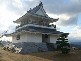 城はそれほど大規模なものではなく(とはいえ、「城郭体系」によると島嶼の島では最大級であるとあるから、この辺りの城の中では大きなものなのかもしれない)、歴史館の建つ1郭と、駐車場になっている2郭、それにその下の腰曲輪、それだけである。しかし、この狭い区画に、所狭しとばかりに復元建造物が建っている。もちろんすべて模擬ということであろうが、ここの建造物はそれっぽい雰囲気を出しているところがいいのである。駐車場から1郭に入るところにある櫓門や、物見のための櫓など、まさに中世城郭の雰囲気を伝えているといっていい。模擬天守こそは、いかにも模擬風なもので、実際にこれほど立派なものはなかったのではないかと思われるものなのだが、全体を下見板張りで覆った無骨なデザインは、かなり個性的なものである。模擬天守といえばだいたいどの城にいっても似たようなものばかりが多いのであるが、この城と同じデザインのものはよそでは見たことがない。誰がデザインを担当したのかは知らないが、なかなかいいセンスだと思う。