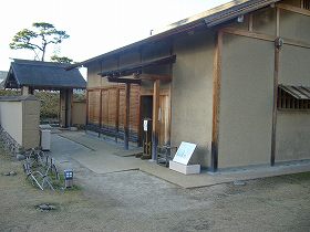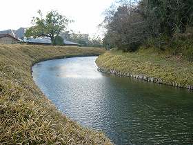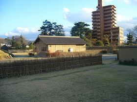 | 築地を隔てて、別の建物を見た様子。 | 復元区域の北側の内堀。堀の外側にもしっかりとした土塁が積まれているのが特徴的である。 |