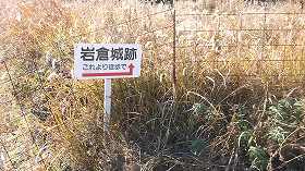 | 南側から遠望する岩倉城。比高20mほどの台地である。 | ところどころに岩倉城への案内が出ているので、これにしたがっていけばよい。この案内板から先は徒歩である。 |