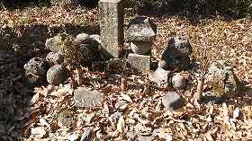 このコンクリート小屋の背後には記念碑が建てられており、また前面には城主の墓と呼ばれる墓石がある。この辺りが1郭なのであるが、主郭であるというのに規模も小さく、あまり平坦でもない郭である。
