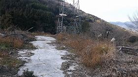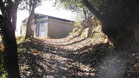 その先を進んでいくと、腰曲輪から1郭に登って行く坂虎口が見えてきた。もっとも、この通路は後世開削されたもののように思われる。1郭にはコンクリート製の作業小屋のようなものがあり、これを建設する際に付けられたものなのであろう。