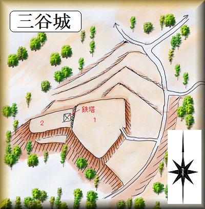 このように三谷城は小規模な城館であるが、山側の背後を谷に守られ、正面は急峻な台地の斜面となっている。山の中腹にしては、城を築くのにまとまりのよい地形であり、それを利用して築かれた城郭である。