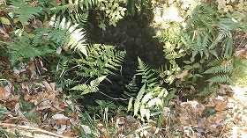 | 1郭の堀切。深さ6m、幅8mほどもある大規模な堀切なのだが、ヤブがひどくて形状を把握しにくい。 | 1郭内部にある井戸。石組みの大規模なものであるが、周囲にロープも何も張られておらず、ぼんやり歩いていると危険である。 |