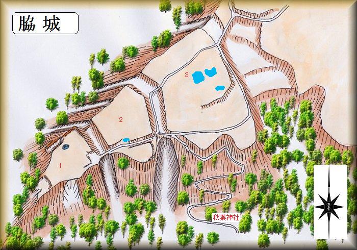 脇城は秋葉神社の背後にそびえる比高60mほどの台地先端部に築かれていた。この台地は東側は台地続きになっているが、特に南側は鋭い急斜面となっている要害地形である。