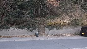 一方、城址の東側は切り通しの道路となっている。城山の裾部分にはコンクリートが廻らされているのだが、一カ所、コンクリートの切れ目に石段が付いている所がある。ここから登って行くのが一番分かりやすいルートであると思われる。