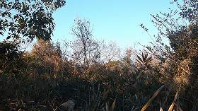 | 東側山麓のコンクリート壁の隙間から登り口が付けられている。 | 1郭内部。ヤブがひどすぎてさっぱり分からない。それに茨も多い。 |