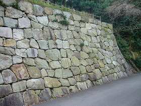 | 南麓の天理教の協会付近から見た城山。比高60mほどだが、非常に目立つ山である。山頂近くの駐車場まで車で行くことができる。 | 駐車場に向かう途中にあった石垣。模擬にしてはよく積まれているように見える。 |