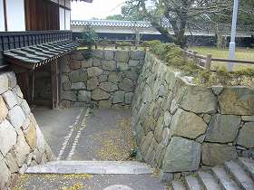 | 本丸への入り口。城塁がななめに切ってあるのは後世の改変かと思ったのだが、古図でもこの通りになっていた。 | 西側下の内堀は、庭園のようになっていた。 |