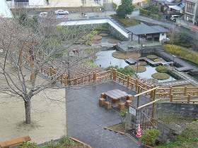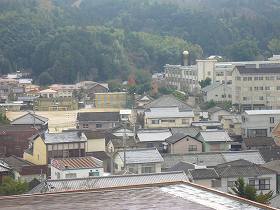 | 本丸内部から見た天守、高欄櫓、台所櫓。 | 本丸から三の丸跡に建つ大洲高校を見たところ。よく見ると写真中央に三の丸の南隅櫓が半分見えている。このすぐ左側下が外堀であったのだが、すっかり家が建て込んでしまっている。 |