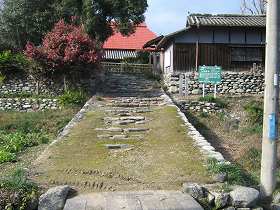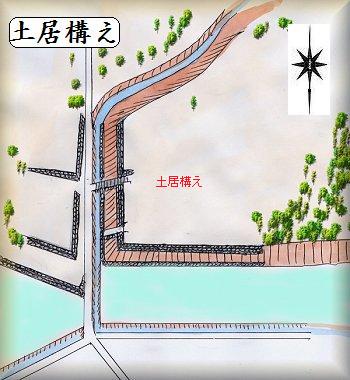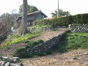 大手も東側側面部にあったのであろう。そこに大手口らしい石段が残っている。そこを進むと右側に折れて門が建っている。ただし、内部は民家の敷地であるようで、見学できるjのはここまでである。この門の脇に、「土居構え」の標柱と案内板とが立っている。