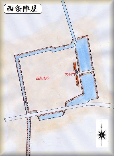 西条陣屋は現在、西条高等学校の敷地となっている。方200mほどの広い区画を廻って現在も水堀が残されている。