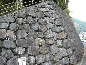 案内板の脇の道路沿いにも石垣が積まれている。これは遺構なのかどうか・・・。道路の法面工事の場合、もっと近代的なコンクリート工事を施すのが普通であるから、このような石垣が道路工事に伴って築かれたとは考えにくい。したがって、これを遺構としてみてもよさそうな気がするが、もっと古い時代の工事で築かれたものだとしたら、よく分からない。