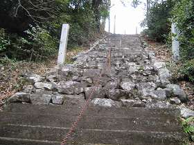 | 神社入口の道路脇には石垣があるが、これも遺構なのであろうか。 | 石槌神社参道の石段。 |