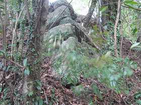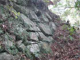 さらに降りていく際に、登って来た時の石段ではなく、南西側の虎口状になった部分から降りていくと、その両脇にも石垣が残っていた。やはりこちらも部分的な構造物にしか過ぎない。石垣は全方位的に築かれていたわけではなかったのだろうか。