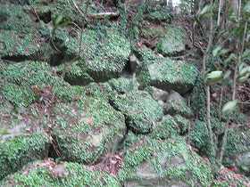| 旧参道脇にある石垣。 | 南西角部分の石垣。あちこちに石垣が残存しているが、残っているのは部分的なものばかりである。 |