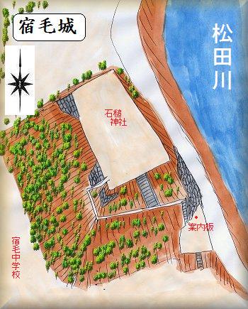 宿毛城は宿毛中学校の北方にある比高30mほどの石槌神社のある独立台地に築かれていた。台地の東側には松田川が流れている。
