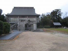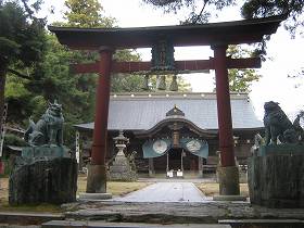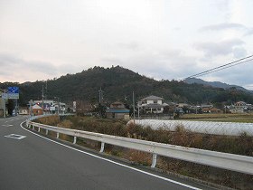 | 北東から遠望した一宮城。ここからの比高は120mほどある。 | 山麓の一宮神社。この駐車場に車を停めておくことができる。 |