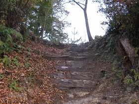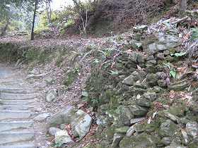 そこから遊歩道を上がっていく。最初は登りが少しきついが、すぐに尾根に出て、後は平行移動が中心となるので、それほど大変な登城道ではない。それに、ここの石段は、登城道にしては珍しく、段の幅が小刻みに造られているので、とても歩きやすいのである。快適な遊歩道である。
