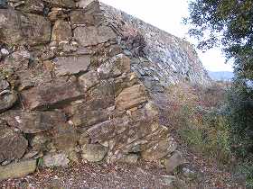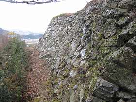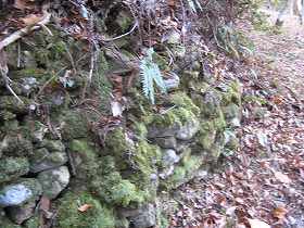 | 登城道を上がって行くと、米倉跡の先の曲輪側面から石垣が積まれているのがよく見える。 | 小さい石だが、城塁に沿って長く続いている。よくぞ崩れずに残っているものだ。 |