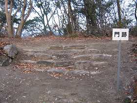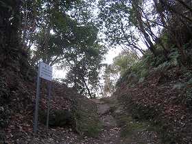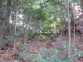 | 財蔵丸と明神丸との間の堀切。深さ7mほどもある。左側は財蔵丸への虎口となっている。 | 明神丸下尾根部分へ続く虎口。かつて櫓門でも建っていたのであろうか。 |