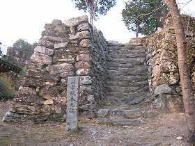 | 明神丸の虎口。石段が付けられている。 | 明神丸の反対側にある本丸の虎口。かなり立派な石垣である。石段は急で登りにくい。 |