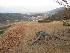 本丸もピークを削平したもので、広さはあまりない。長軸40mほどであろうか。しかし木が1本も生えてなく、すこぶる眺望が良い場所である。ここから南側に降りたところに釜床跡があった。籠城時、ここで炊事が行われていたらしい。
