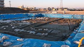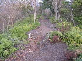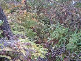 | 鉄塔を越えた先を登ったところが小倉丸である。写真はその内部。細長い郭で2段に分かれている。 | さらに尾根を進んで椎の丸内部に入る。こちらはまったく整備されておらず、シダ類が繁茂していて、なんだかよく分からない。 |