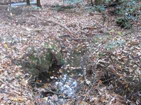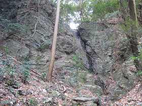 | 椎の丸から降っていったところの谷戸内部にある貯水池跡。現在ではほとんど水が溜まっていない。 | 貯水池ノ下にある陰滝。高さ7mほどの岩場である。城内に滝があるというのもすごい。 |