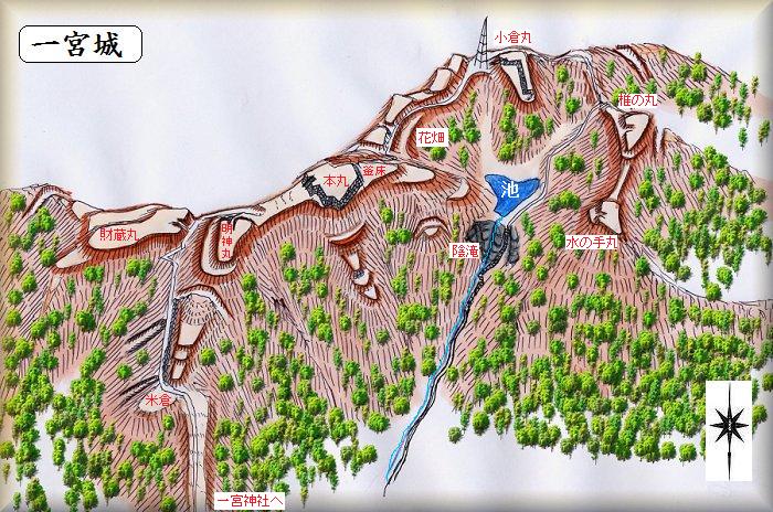 一宮城は、一宮神社の南側にそびえる比高120mほどの山稜一帯に築かれている。北側山麓の一宮神社から遊歩道が付けられているので、それにしたがって登っていけばよい。車も神社の駐車場に停めておくことができる。