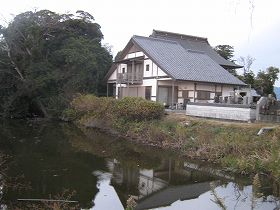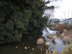 | 勝瑞城南側の堀。 | 同じく南側の堀と見性寺。土塁はこちらがわには見られない。 |