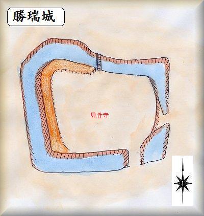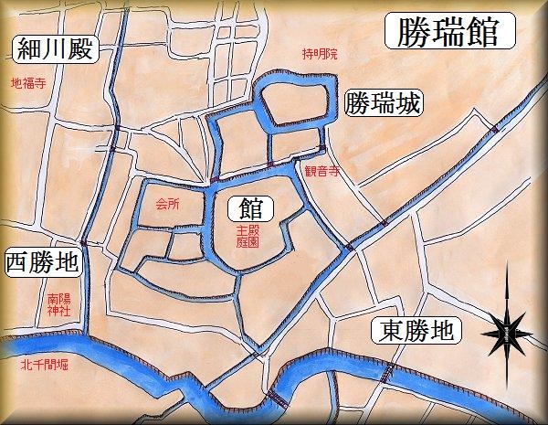 以前、勝瑞城は上記の単郭の城郭のみかと思っていたのだが、近年発掘調査などが実施され、実際には複数郭を有する大規模な城館であったことが明らかになってきた。そこで勝瑞遺跡デジタル博物館や守護町勝瑞遺跡のページの内容を参考にして描いてみた鳥瞰図が右のものである。ちなみに、勝瑞城と勝瑞館とは合わせて「勝瑞城館」として国指定の史跡となっている。