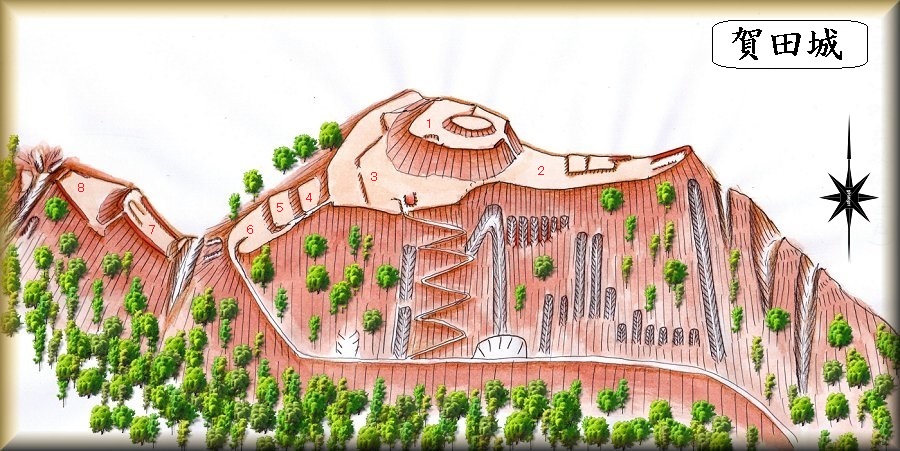毛利氏が瀬戸山城に籠る赤穴氏に降伏を迫った時、徹底抗戦を唱えた赤穴氏配下の森田氏と鳥田氏が籠った 「松本山の石城」が賀田城とされている。