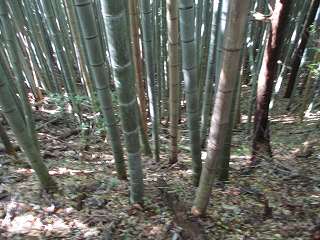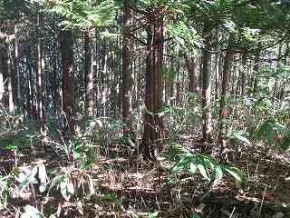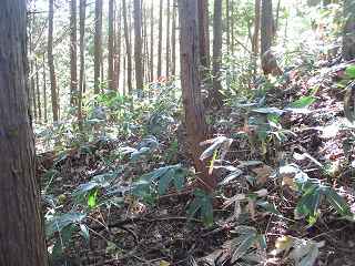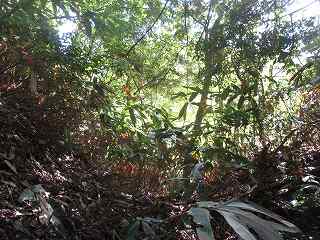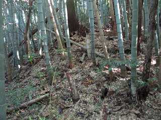 神社から城までの登城道は見当たらなかったので神社の南側から尾根を直登していくことにした。急斜面であるが竹に取り付きながら何とか登って行く。