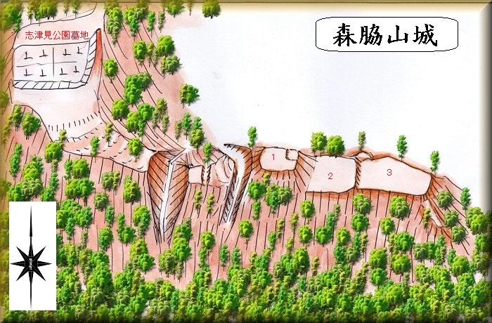 角井城郭群から山稜を越えて2.5kmほど東側に進んだ志津見地区に森脇山城は築かれている。東側下の神戸川に臨む比高50mほどの山稜先端部分である。