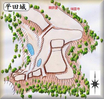 “平田城跡” 平田城は別名を手崎城・薬師城と呼ばれる中世の山城です。応永から大永年間(1394〜1528)まで、京極氏の家臣多賀氏が根拠としていましたが、その後尼子氏が再興をはかって根拠としていた高瀬城(簸川郡斐川町荘原)に対して、毛利方が入城したことにより、このあたりで両者による合戦が行われたといわれています。 この場所が主郭のあったところであり、周囲にも付属する郭が築かれ、西1の郭・西2の郭などに当時の面影を残しています。また、郭の附近には堀切があり、当時の城郭構造を知ることができます。 平田市