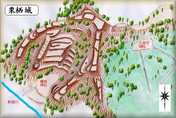 丘陵の麓にあるこの城の説明版には、久奈子神社のあたりに館跡があったと伝える。しかし、城全体の形からは、櫃森神社のあたりに考えるべきだろう。久奈子神社の西側に、中国自然歩道となった旧備後街道が通るが、現在の栗栖城はここまで広がらない。浄土寺山城移転後の古志氏の居城と伝える。
