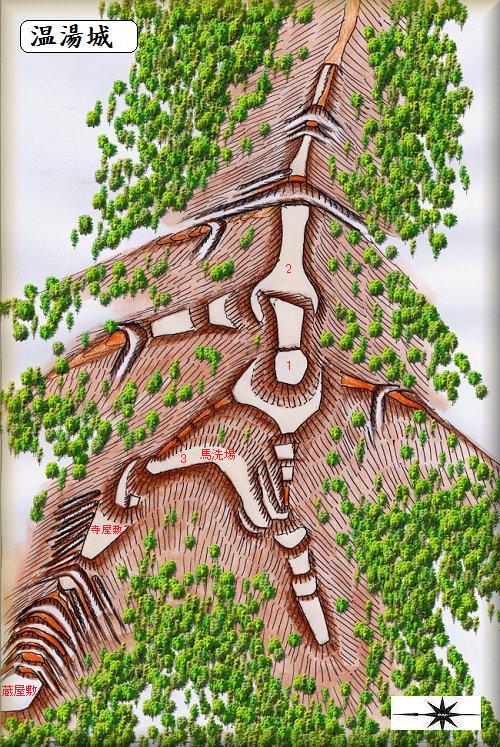 以下、山城攻城記より引用 概 要 @郭(主郭)は2段から成り、北側に虎国が認められる。 A郭の東端の高まりは櫓台と思われる。尾根筋は櫓台と連続竪堀によって遮断している。石垣が築かれている B郭は「バセンバ」と伝えられているが、居住空間の可能性がある。「テラヤシキ」と伝えられている C郭から「クラヤシキ」と伝えられる D郭にかけて連続堀切群と連続竪堀群が築かれている。この城は一時石見銀山を領した小笠原氏の居城とされる。 島根県教育委員会『島根県中近世城館跡分布調査報告書』より引用 歴史 初代 小笠原長親 1281〜1313 元寇の際に石見国に駐留して守る、その功により石見国邑智郡を過領される また石見国国人益田兼時の娘の美夜姫と結婚、その引き出物として川本周辺の所領を送られ、川本を領有する 三島大明神か勧請する 弓ケ峰神社を勧請する 二代目 小笠原家長 1314〜1333 永仁年間(1293〜1298)に村之郷周辺を知行する(ここを本拠とする) 建武の新政のころの争乱で討死とある(丸山伝記) 三代目 小笠原長胤 1334〜1346 南北朝の動乱期において北朝につき南朝方の楠木判官(楠木代官・福富氏)を討取る功により赤城と温湯城の地域を賜りここに城を築く 興国年間(1340〜1346)から正平年間(1346〜1369)に温湯城を築城する おそらく完成したのは四代目の長氏頃 四代目 小笠原長氏 1346〜1383 1348年 南朝の三隅氏居城である三隅城を北朝軍の一員として攻めるが戦果を上げられず 1350年 足利直冬が反乱 佐波顕連は三隅氏、福屋氏、吉見氏らと共に反尊氏の兵をあげた、これを討伐するために佐波の青杉城を攻略する 結果佐波顕連は討死する この功により佐波の領地であった都賀、都賀行、銅が丸鉱山を尊氏から賜る その後も北朝方として活躍、三原、長谷の地も領有する事となる 1354年 南朝方の足利直冬が勢力を立て直し三隅氏、益田氏、福屋氏、吉見氏らを引連れて温湯城を攻略するが堅牢の為落城できなかった 軍記物ではその後和議を図り、小笠原氏も南朝に下るが1355年に京にて直冬軍が敗北して北朝方に戻った 1359年 南朝方であった邑智郡阿須那の高橋氏が北朝方の出羽氏の二つ山城を攻略、援軍として動くが福屋氏に邪魔をされて間に合わず 二つ山城は落城する 五代目 小笠原長義 1384〜1408 1394年 本拠を村之郷から川本に移した 息子らを各地に配して所領強化に努めた 六代目 小笠原長教 1409〜1414 1413年 江津市川戸の土屋氏が妻の実家である都治家の乗っ取りを画策、幕府が土屋氏征伐を行い小笠原氏もこれに従う 結果落城し降伏した、長教はこの戦いの功により幕府より日和、大貫の地を知行された 1409年と1414年に甘南備寺に寺領を寄進する(祈願寺) 七代目 小笠原長性 1414〜1443 息子らをそれぞれ分領に配して所領の強化に努める 八代目 小笠原長直 1443〜1461 朝鮮貿易を活発に行う 九代目 小笠原長弘 1462〜1489 大内氏に従い各地を転戦する 1460年 足利義政が畠山義就討伐を命じる、長弘も大内氏の従い河内の畠山義就討伐に出陣する 佐波氏との抗争が激化する 十代目 小笠原長正 1490〜1505 1491年 湯谷長江寺を創建 1504年 湯谷八幡宮を勧請する 十一代目 小笠原長定 1506〜1525 妻は宍戸姓の女とある 安芸甲田の五龍山城 宍戸氏 十二代目 小笠原長隆 1525〜1542 1511年 船岡山の戦いに従軍する 石見国の守護に任命される 1537年 尼子氏が侵攻して小笠原氏は尼子氏に従った 1540年 尼子氏に従い毛利の吉田郡山城を攻撃 途中次男の長晴が討死する 1541年 石見銀山を支配下に置く 十三代目 小笠原長徳 1542〜1547 1542年 銀山を支配した また尼子氏に従軍して勝利に貢献、褒美として、大家、三原、下都治、延里、佐摩、白杯、井原を知行された 十四代目 小笠原長雄 1547〜1569 1548年 3月銀山に入部して大いに賑わう 1557年 毛利元就に井原を攻略される 1558年 毛利元就に村之郷を攻略されると徐々に包囲される 1559年 このころから温湯城を包囲される、尼子軍も援軍にきたが、江の川の洪水にて援軍出来ぬまま退却し、結果毛利の軍門に下る 温湯城をでる 十五代目 小笠原長旌 1569〜1595 円山城を築く 出雲国神西軍大島に移動させられる 妻は小早川隆景の息女との記載もあるがおそらく養女か?輝元公御判物之御書に三原御局とあるので小早川氏の縁のものと思われるが ひょっとしたら「三原」は広島の「三原」ではなくて、川本町にある「三原」の縁の人間かもしれない |