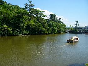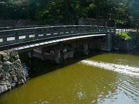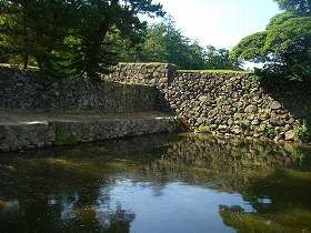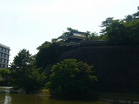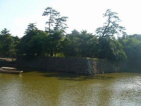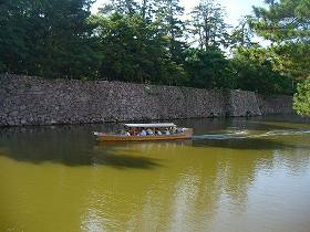 西側駐車場近くにある掘割から遥か城址を遠望した所。天守の屋根が少しだけ見えている。大手前の駐車場がいっぱいだったので、こんな遠くまで停めにこなくてはならなかったのである。 | 城の西側の堀。幅が広く、深さもありそうだ。この堀には遊覧ボートがひっきりなしに通っている。以前はこんなのはなかったような気がする。 |