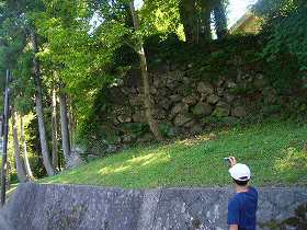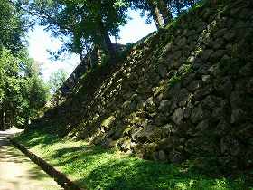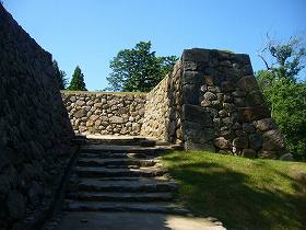 本丸北側の石垣。野面積みでよくぞここまで積み上げることができたものだ。 | 本丸搦め手門方面の枡形の石垣。 |