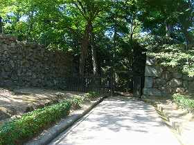 城山稲荷と護国神社のある北の丸方向から城内に入り込んだ。 | 北の丸と本丸との間の堀切。本丸側には高い石垣がある。 |