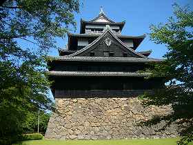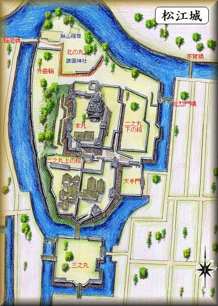 (以前の記述) この天守、なぜか昔からとても好きだ。「一番好きな天守は?」と聞くと姫路城なんかを押す人がやはり多いが、この松江城の無骨な感じが、なんともたまらないのである。関ヶ原の役直後に堀尾吉晴によって築かれ始めた城だから、ちょうど初期望楼式天守の、最後の形態の一つと言えそうだ。付け櫓を附した主殿の上に三層の望楼を載せた形だが、三層目の張り出し風の漆喰造りの破風がなんともかわいいと思うのは私だけであろうか。華灯窓と両脇の窓がコアラの顔のようだ。最上層の望楼の造りも独特だ。天守内部に井戸があるのも珍しい。 (松江城の歴史) 松江城を築いたのは堀尾吉晴である。関ヶ原の駅で東軍に味方した堀尾氏は、戦後、浜松12万石から、倍増の出雲・隠岐24万石の太守となった。 堀尾吉晴が最初に入城したのは月山富田城であった。しかし、この城は中世から続く城であり、山奥に引っ込んだところにあるため、近世大名の城としてふさわしい地取りではなかった。そこで、宍道湖のほとり、水陸の要衝である松江に新城を築くことにしたのである。 『城郭体系』によると、松江城建設の経緯は以下のようであった。 慶長12年(1607)・・・資材運搬道路、橋梁の建設。城下町の造成と、本丸、二之丸の地ならしが行われる。 慶長13年(1608)・・・本丸の石垣、天守台、内堀が造られる。北側の尾根続きの部分は、山そのものを削って平坦にするという大工事であったという。 慶長14年(1609)・・・天守の建造、二之丸坂口、大手口枡形、大手堀の石垣、二之丸御殿の建造に着手。 慶長15年(1610)・・・天守、二之丸御殿が竣工、堀も完成した。 慶長16年(1611)・;・・この年が総仕上げの年であり、侍屋敷が完成して家臣団が富田城下から移住してきた。 堀尾吉晴の後は忠氏、忠晴と続いたが、忠晴には嗣子がなく、堀尾氏は3代で断絶した。 堀尾氏の後には京極忠高が入城したが、これまた嗣子なく、1代で断絶した。 その後、寛永15年(1638)、信州松本から松平直政が入部してきた。この松平氏の治世は安定しており、10代続いて明治維新を迎えることとなった。 |