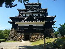 入場券売り場のある南側の櫓前から見た天守。やはりこの角度が一番絵になるようだ。 | 正面から見た天守。天守台の縁きっちりに建物を建てているのがすごい。 |