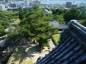北惣門橋。 | 北東側から見た松江城。中央奥に天守の最上層が見えている。 |