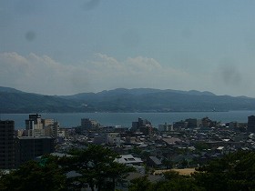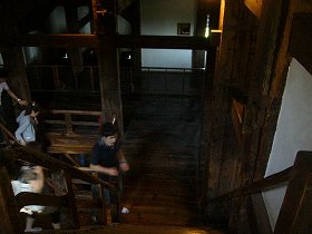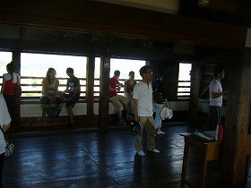 天守から遠望する宍道湖。なかなか景色が良い。それに風が通っていて、けっこう涼しい。 | 天守内部。観光客でいっぱいである。 |