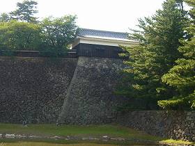 大手枡形の外側の石垣と堀。 | 南櫓を城外側から見たところ。 |