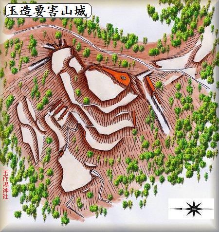 以下、山城攻城記より引用 概 要 玉造温泉街を見下ろす丘陵頂部に所在する。主郭は最高所と考えられ、尾根筋に対して櫓台と土塁を築いて防御を固めている。 主郭の南狽1に続く郭には井戸が確認され、尾根筋に対しては櫓台の南側に接して土塁を築いている。 さらに主郭の西側を取り巻いている郭の南端にも尾根筋に対して土塁が築かれており、主郭の櫓台を核とした土塁による防御ラインの存在が読みとれる。 また、主郭南側に築かれている堀切は本来存在した堀切の主郭側壁面に新たに築かれたものである。 尾根筋に対する櫓台と土塁による防御ラインの設立と同時期に築かれたものと考えられる。 土塁を食い達わせた虎日の存在等から考えると毛利軍による改4笏強化も考えられる。 城郭の北側に連続竪堀群が確認できるが、尾根筋の方面には確認できなかった。湯氏の居城として知られる。 島根県教育委員会『島根県中近世城館跡分布調査報告書』より引用 玉造要害山城 中世の山城、湯ノ城とも言う、標高108mの半独立丘陵で、山頂および山腹に削平地が数段にわたって残り、土塁、空堀、井戸跡なども見られる。 小規模だが保存は良好である。 この城は元弘2年(1332)頃、湯庄留守職諏訪部扶重が最初に築いたと言われ、同世紀の中頃、出雲国守護代佐々木伊代守秀貞がさらに改修、増築したとされている。 その後は、湯庄支配の本拠地として、湯氏代々が居所したと思われるが詳細は不明である。天文11年(1542)には湯佐渡守家綱の名が記録に見え、その墓とされる祠が城域内に残っている 昭和57年1月 玉湯町教育委員会 歴史 |