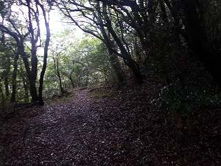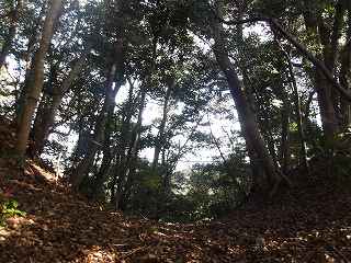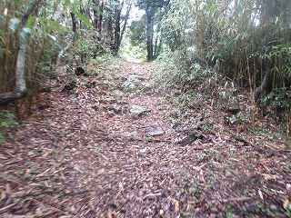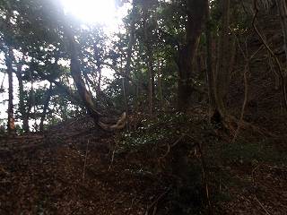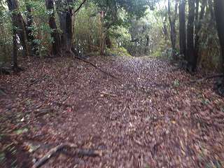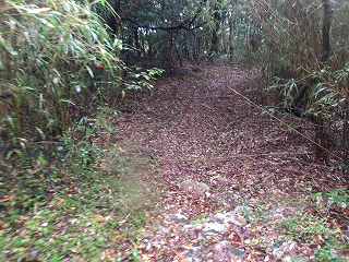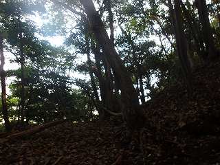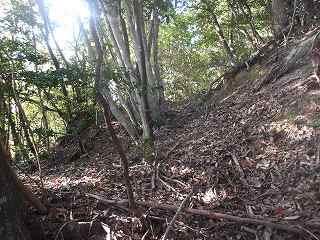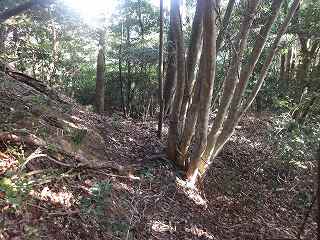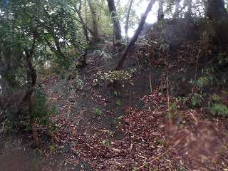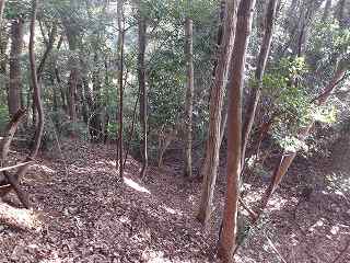 登城道は尾根に上る途中から、ひたすら斜面を東側に向かって斜めに進んで行き、海老山城本体の西側下の鞍部の所に出るようになっている。