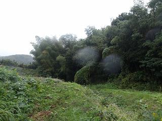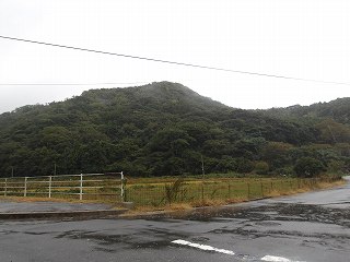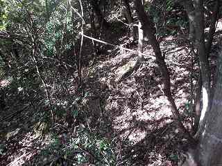南方から。 | 登城道入口。案内もなく、一見、道があるとは思えないが、登って行けばロープが張ってあるのが分かる。 |