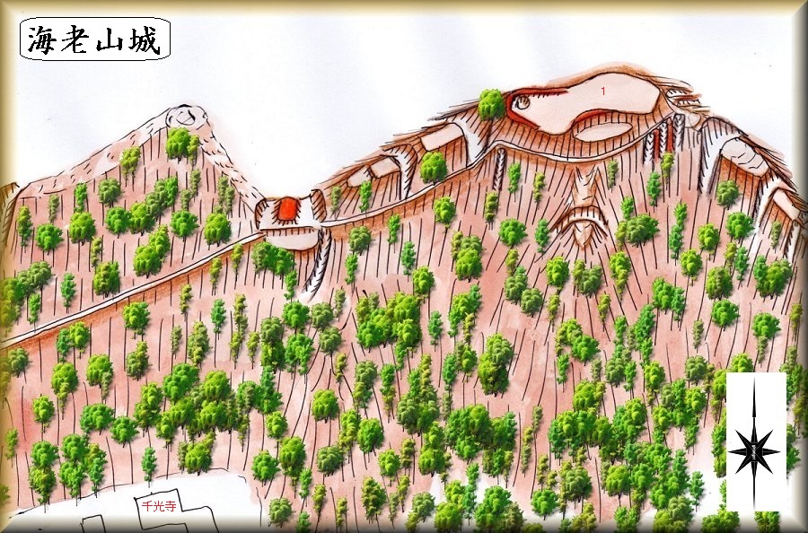 千光寺の背後にある比高90mほどの山稜が海老山城の跡である。千光寺がある場所も居館跡のような雰囲気がある。