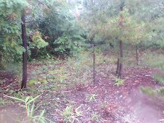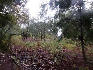 ここから北側に進んで行くと3重堀切や畝状竪堀があるらしいのだが、ヤブがひどい。雨の中ヤブ漕ぎはできないので、そこまで行くことはできなかった。
